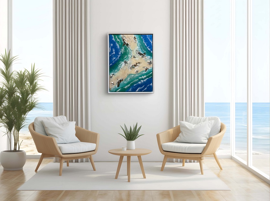 Questo quadro in resina cattura l’essenza del mare, con onde azzurre e trasparenti che si infrangono dolcemente sulla riva, creando una spuma bianca delicata. Piccole pietroline e conchiglie naturali sono incastonate nella resina, aggiungendo profondità e autenticità, trasformando ogni sguardo in un viaggio verso la tranquillità della costa.